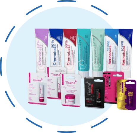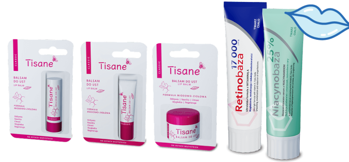 Tisane Classic (pomadka blister), Tisane Classic (słoik blister), Tisane Classic (tubka blister), Tisane Classic Men (pomadka blister), Tisane Color Miód Malina (pomadka blister), Tisane Farm wosk regenerujący do paznokci i skórek (tubka blister), Cremobaza 10%, Cremobaza 30%, Cremobaza 50%, Retinobaza 10 000, Retinobaza 17 000, Colostrobaza 5%, Niacynobaza 25%